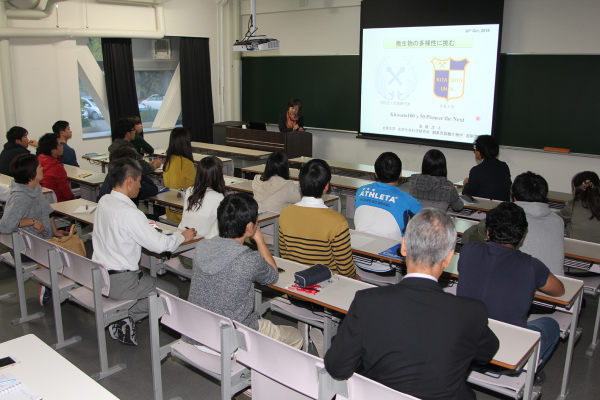 その後、高橋名誉教授は本学生命環境学部生命・応用微生物学研究室の学生・教員らを前に、これまで行ってきた研究や様々なご経験などを交えながら講演されました。