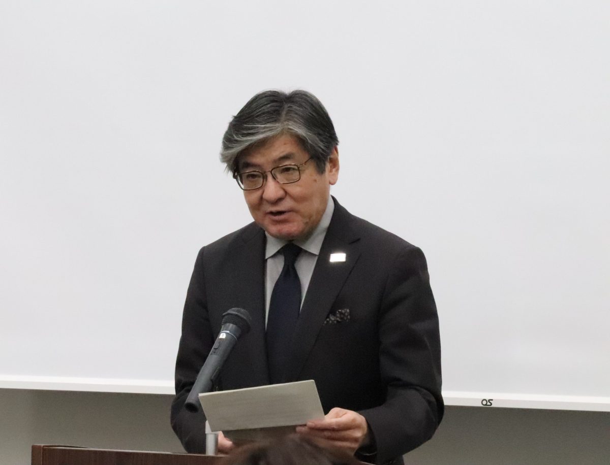 その後、講座を担当した岡嘉弘水素・燃料電池技術ナノ材料研究センター客員教授による総括報告がされ、中村学長から修了生に修了証書が授与されたのち、修了生代表がこれまでの感謝と今後の決意を述べました。最後に、飯山明裕水素・燃料電池ナノ材料研究センター特任教授が閉会の挨拶を述べました。