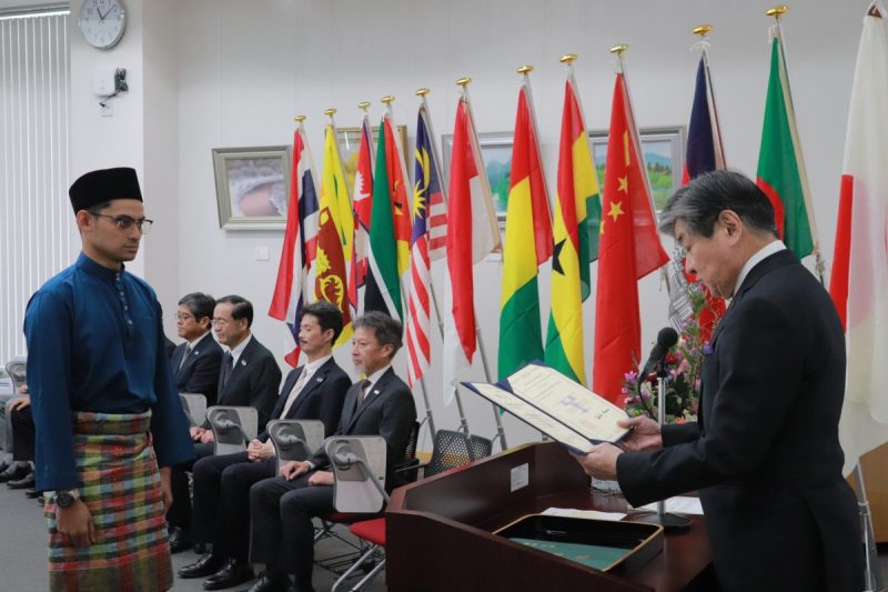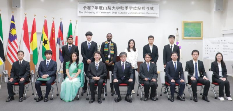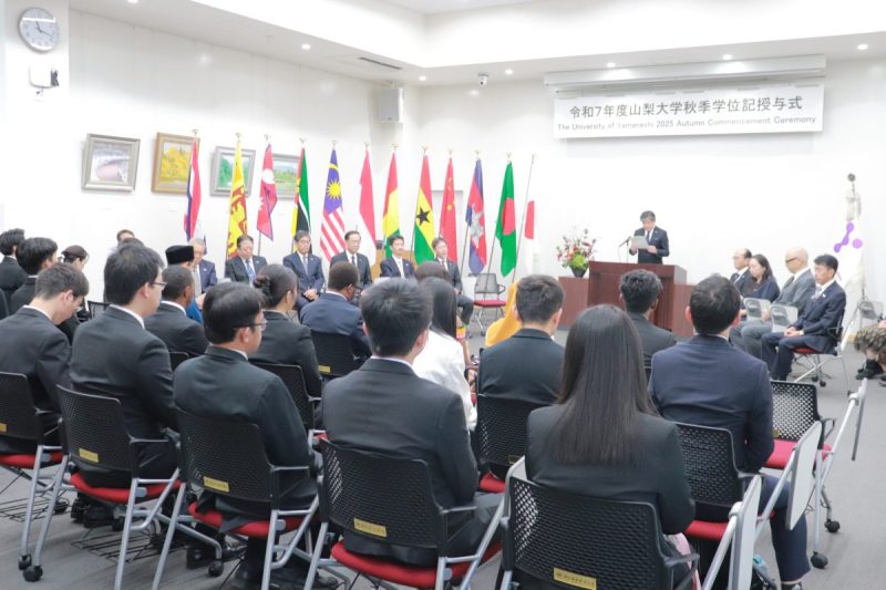 式では、中村和彦学長が卒業・修了する各課程の代表学生に学位記を手渡し、「The experiences you have gained here will be a great source of strength in addressing these challenges.Most importantly, I urge you to take the initiative in engaging these issues in your respective fields, to collaborate across disciplines and cultures, and to create new value. Such efforts will surely contribute to the development of local communities, extend beyond borders, and ultimately enrich the future of the international community.」と式辞を述べました。