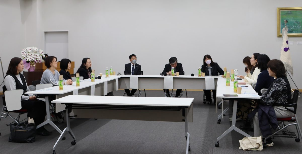 表彰式に続いて、「女性研究者と中村学長との懇談会」が開催され、受賞者の秋山教授に加え、女性研究者 6 名が参加しました。懇談会では、今回のテーマである男女共同参画推進室が実施するキャリアアシスタント(CA)制度について、制度の利用による効果や今後の活用等に関する意見が交わされました。また、女性研究者を取り巻く研究環境についても話し合われ、和やかな雰囲気の中、活発な意見交換の場となりました。