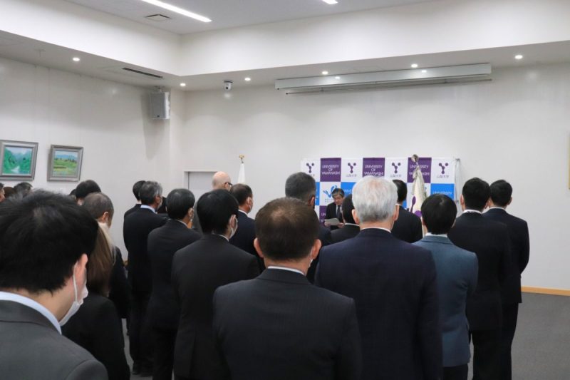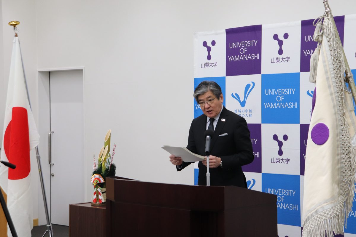 最後に、今年を象徴する漢字として「恕(じょ)」を選び、常に相手の身になって物事を考える優しさや思いやりの必要性を説明したうえで、「教職学協働」を本学のビジョンとし、「山梨大学の皆さんが、深い信頼の中で、今年一年、『恕』の心を共有しながら、『教・職・学』がともに歩む大学を目指してほしい」と語りました。そして、「皆さまの声にしっかりと耳を傾けながら、誠心誠意その責任を全うする」との決意を示しました。